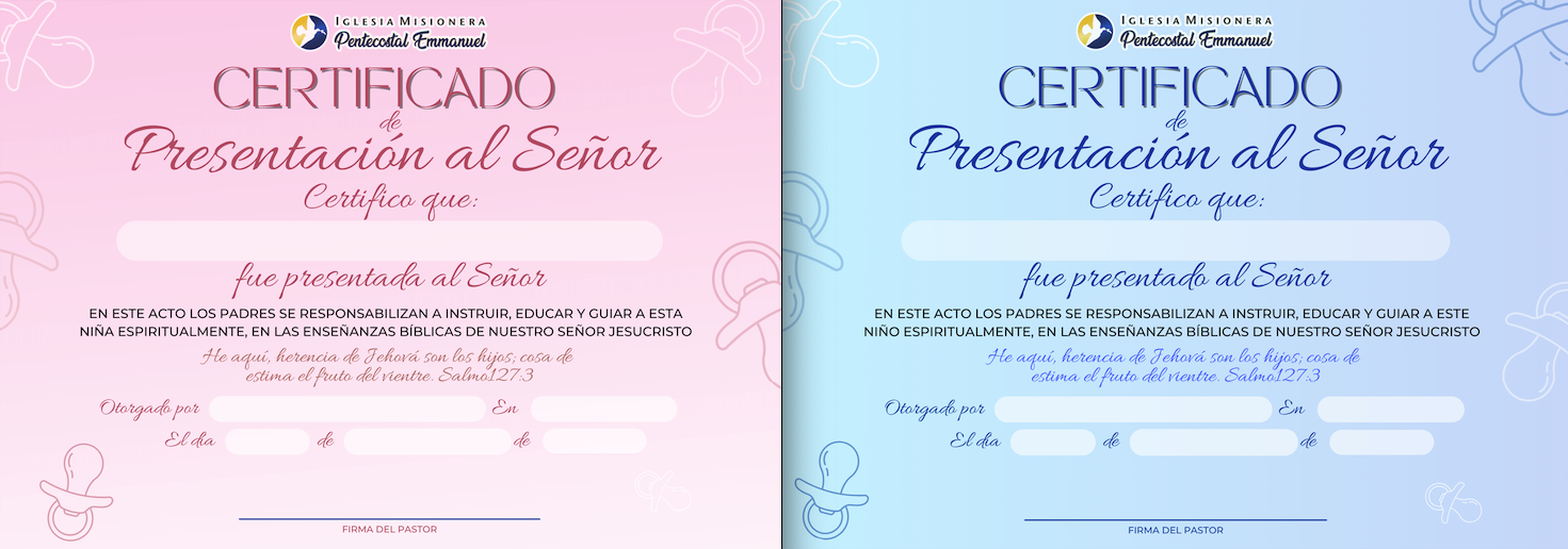 Descarga los certificados oficiales de presentación de niños de la Iglesia Misionera Pentecostal Emmanuel.